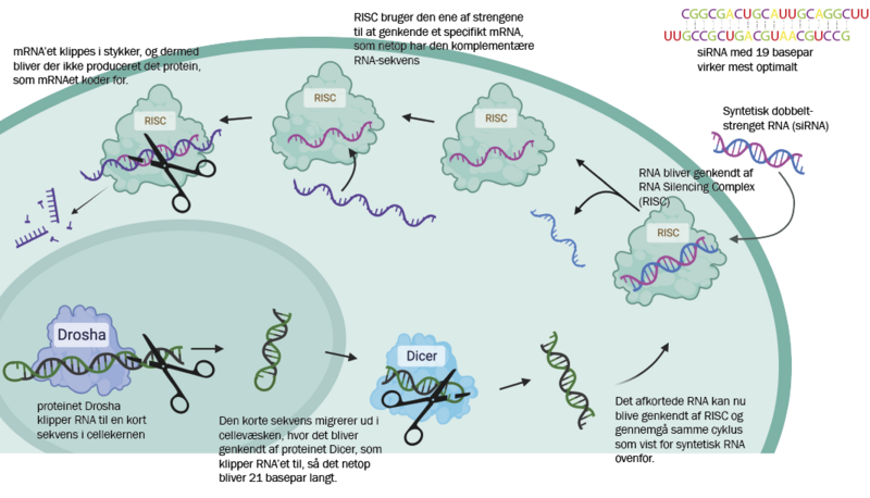 Figuren viser princippet i at bruge syntetisk dobbeltstrenget RNA (siRNA) til at forhindre produktionen af specifikke proteiner i kroppen (den øverst del af figuren). Metoden er effektiv, da ét dobbeltstrenget RNA kan slukke for produktionen af mange proteiner. Det smarte er, at metoden efterligner en naturlig mekanisme (vist nederst på figuren), der hæmmer produktionen af proteiner.