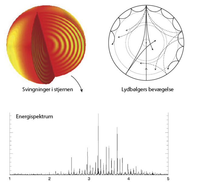 »Stjernerne har svingninger svarende til et simpelt musikinstrument, for eksempel et blæseinstrument, hvor der dannes en grundtone og en række overtoner. Afstanden i frekvens er nogenlunde lige stor mellem grundtonen og første overtone og mellem de følgende overtoner. Men en stjerne er ikke et finstemt instrument, og hvis der er en struktur inde i stjernen, svarer det til, at der er en bule i instrumentet.«