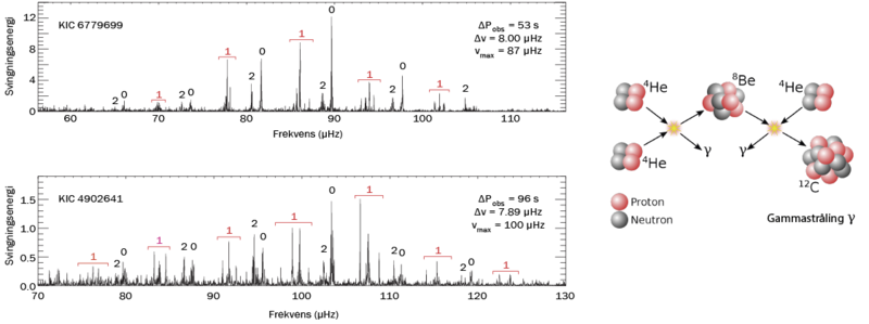 Forskellen skyldes, at stjernen KIC 4902641 (nederste diagram) producerer energi ved kernefusion nær stjernens centrum, hvor tre heliumkerner omdannes til carbon og frigiver energi (figuren til højre). Denne energiproduktion påvirker stjernens opbygning, og det ses ved, at de såkaldte dipol-svingninger (angivet med “1” i diagrammet) spredes og danner flere svingninger med relativ stor forskel i frekvenserne.