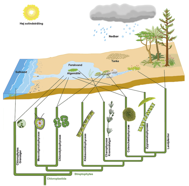 Nogle tænker måske, at de grønalger, som var forløbere for landplanterne, levede i havet, fordi havet er så stort og dækker 70 % af klodens overflade, mens ferskvandsmiljøer blot dækker omkring 1 %. Men vi ved, at landplanters ophav var grønalger fra ferskvand. Ferskvand rummer flere udviklingslinjer blandt grønalger, havet derimod blot en enkelt.