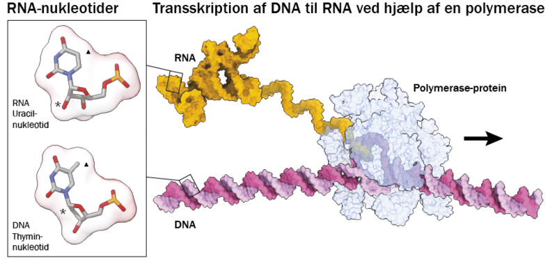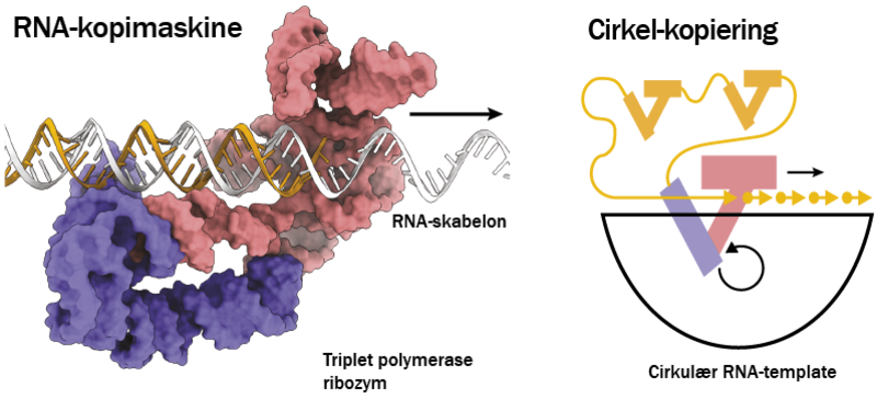 Til venstre ses RNA-kopimaskinen (rød og lilla), som kan forlænge en RNA-streng (gul) på en RNA-skabelon (hvid). Pilen indikerer den retning, som RNA-kopimaskinen er ved at forlænge den gule streng.
