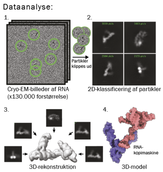 Nu tager man tusindvis af billeder, som analyseres med en computer, hvor molekylerne bliver identificeret i isen som små mørke partikler (se trin 1). Disse partikler bliver klippet ud og klassificeret i 2D ud fra de forskellige orienteringer af partiklerne (trin 2). Man skal gerne have mange partikler i alle de forskellige orienteringer, som molekylet kan have, og til denne proces skal man bruge tusindvis af partikler set fra alle retninger. Efterhånden som 2D-klassificeringen forløber, ser man sit molekyle bedre og bedre. Til sidst bestemmes den 3-dimensionelle struktur ud fra de forskellige orienteringer i 2D (trin 3). Under optimale betingelser kan man med denne teknik se de enkelte atomer i biomolekylet og bygge en atomar model (trin 4).