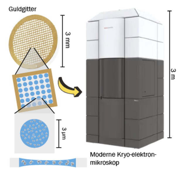 Kryogen elektronmikroskopi er en populær metode til at bestemme den 3-dimensionelle struktur af biomolekyler. Metoden fungerer ved, at en prøve af biomolekyler dryppes på et gitter og hurtigfryses til meget lave temperaturer (-200 °C). På den måde opnår man, at biomolekylerne fanges i en gennemsigtig is. I mikroskopet skydes elektroner på prøven, og de afbøjes, når de rammer biomolekylerne. Derved får man et billede, der er mørkt, hvor biomolekylerne har afbøjet elektronerne, og lysere hvor der kun er is.