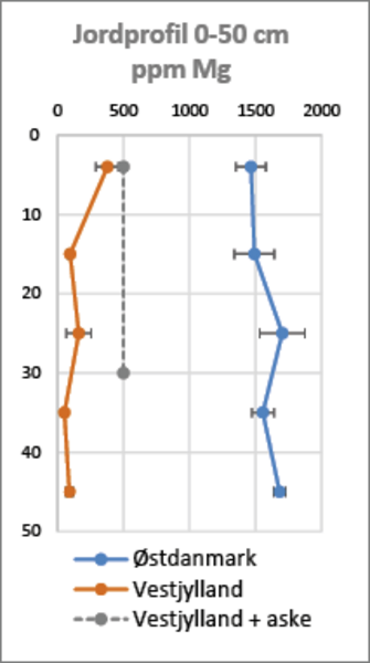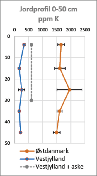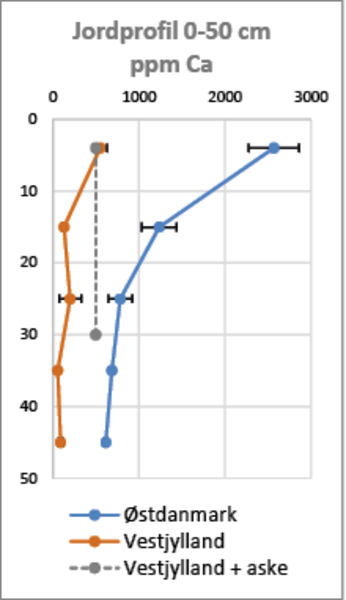Med en stiplet lodret linje vises den elementkoncentration, man kan opnå ved at tilføre 18 ton træaske per hektar og nedblande aske sammen med det organiske toplag til en homogen jordblanding fra 0 til 30 cm.
