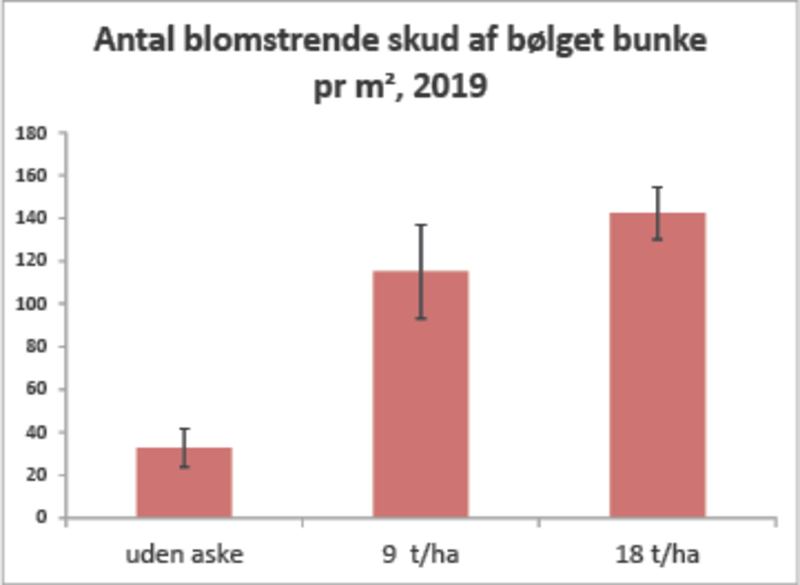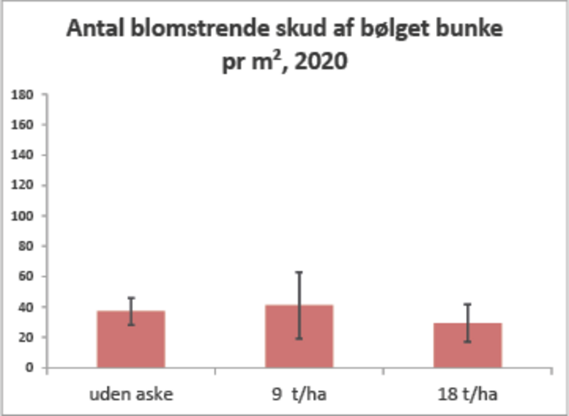 Tilførslen af træaske til skovbunden førte kun til små ændringer i vegetationssammensætningen. Det gælder både før og efter askeudbringning og mellem plots med og uden asketilførsel. Træasken ændrede ikke afgørende plantedækkets sammensætning. Enkelte arter blev dog kortvarigt mere talrige, men virkningen aftog de følgende år. Dette gjaldt eksempelvis for græsarten Bølget Bunke. Det første år efter asketilsætning var der en stigning i antallet af blomstrende skud, men allerede det følgende år var antallet af græsskud det samme på alle plots.