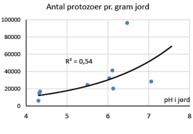Som en indikator-parameter for mikrobiel aktivitet målte vi antallet af protozoer per gram jord i de øverste 10 cm af jorden. Protozoer er encellede organismer, der æder bakterier. Bakterieædere spiller en central rolle i jordens omsætning af organisk stof. Protozoerne er selv føde for dyr højere oppe i fødekæden. Antallet af protozoer per gram jord er en indikator for den bakterielle aktivitet.