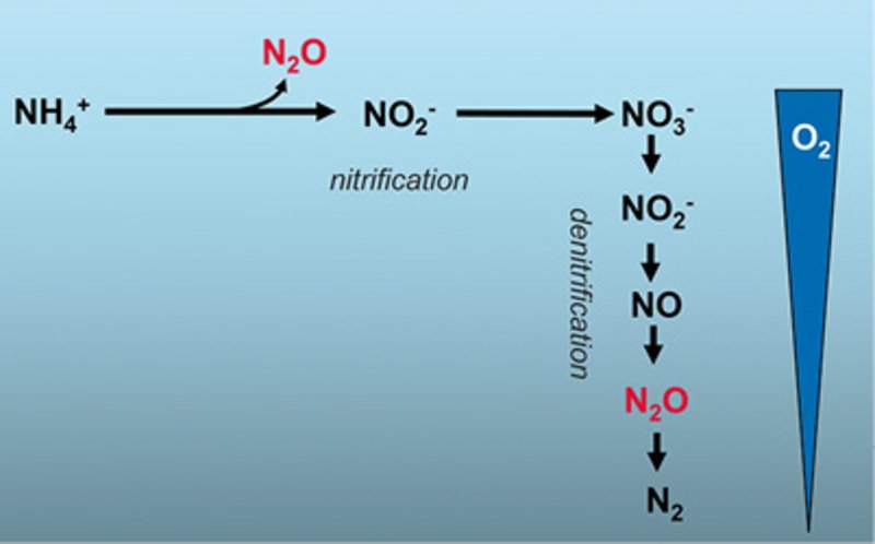 Skematisk illustration af de to kendte reaktionsveje, der producerer N2O. Nitrifikation er en oxidation fra ammonium (NH4+) til nitrit (NO2-) og derefter til nitrat (NO3-). Det kan kun ske ved tilstedeværelsen af oxygen, og N2O er et biprodukt i denne proces. Denitrifikation er en reduktion af nitrat til nitrit, nitrogenoxid (NO), N2O og endelig til N2-gas. I denne proces kan N2O enten blive produceret eller forbrugt. Denitrifikation kan dog kun ske, hvis der ikke er oxygen til stede, og derfor forventer man ikke, at denne proces vil kunne forbruge N2O i overfladevandet i oceanerne.