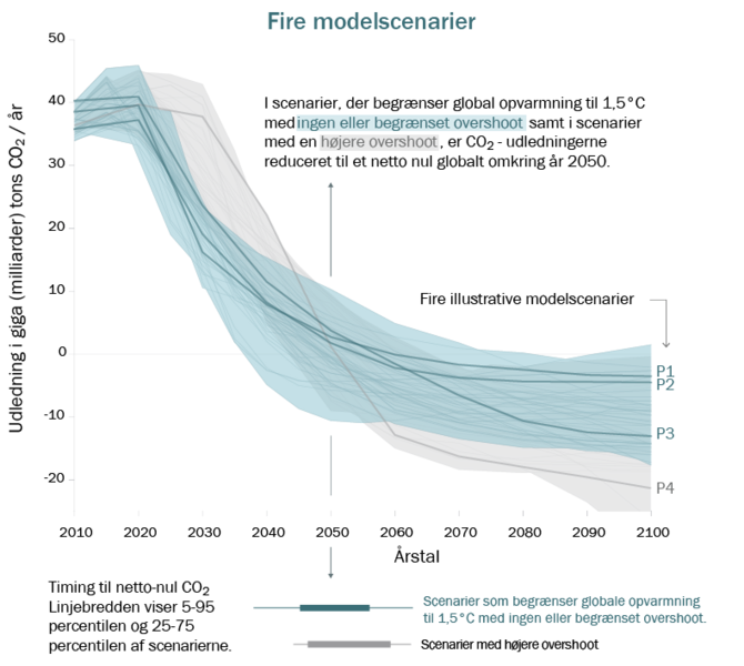 IPCC arbejder med langsigtede mål og prøver at inkorporere al den indsamlede viden i klimamål og -strategier. Generelt er der blevet udarbejdet nogle scenarier for, hvordan man kan opnå klimaneutralitet og overholde Parisaftalen til år 2100. Nogle af disse scenarier inkorporerer overshoots, mens andre opererer med ingen eller næsten ingen overshoot (se figur 2). Hvis man ser på udledningerne i år 2100 for de forskellige scenarier, er der meget stor forskel på deres størrelse. Men for dem alle gælder, at vi i år 2100 skal under det punkt udledningerne rammer nul. Vi skal altså i minus, hvilket kaldes negative udledninger.