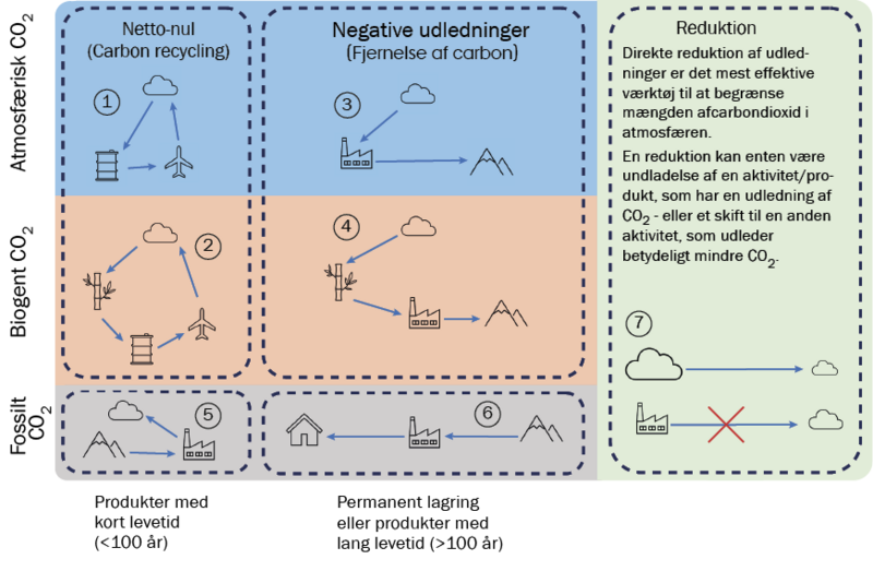 Negative emissioner er illustreret ved 3 og 4 på figuren, hvor CO2 fanget direkte fra atmosfæren eller via biomasse bruges i produkter med lang levetid eller permanent lagres.