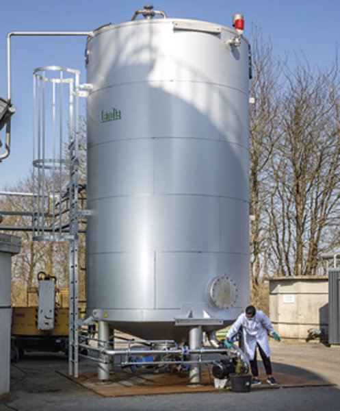 På Aarhus Universitet har vi udviklet en metaniseringsteknologi, sammen med den danske virksomhed Landia A/S, hvor hydrogen tilsættes direkte til en biogasreaktor. Teknologien udvikles på nuværende tidspunkt i projektet “InjectMe”, der er et samarbejde med Landia A/S, University of Queensland og Aarhus Universitet og som støttes af Energistyrelsen (EUDP). På billedet (th) ses den 30 m3 store biogasreaktor, der danner rammen for en stor del af forsøgene i projektet.
