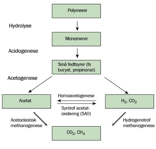 Afhængig af forholdene i reaktoren kan eddikesyre omdannes til hydrogen og CO2, men H2 og CO2 kan også omdannes til eddikesyre. De ovenstående trin katalyseres alle af bakterier, mens det sidste trin i omdannelsen af H2, CO2 og eddikesyre til metan katalyseres af en anden gruppe mikroorganismer, nemlig arkæer (Archaea).