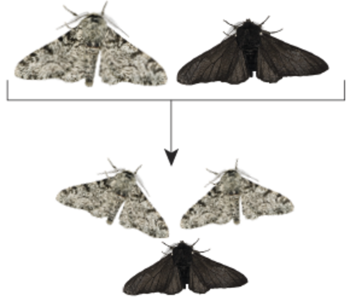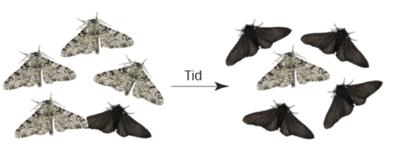 Et berømt eksempel på evolution findes hos birkemåleren (Biston betularia) i England. Oprindelig var birkemålere lyse. En mutation bevirkede imidlertid, at nogle birkemålere i stedet fik en mørk farve. Når individer formerer sig, overføres arvelige egenskaber såsom farve fra forælder til afkom. Mørkfarvede individer forblev dog sjældne idet de var dårligt camouflerede overfor predatorer (fugle) på lyse birkestammer.