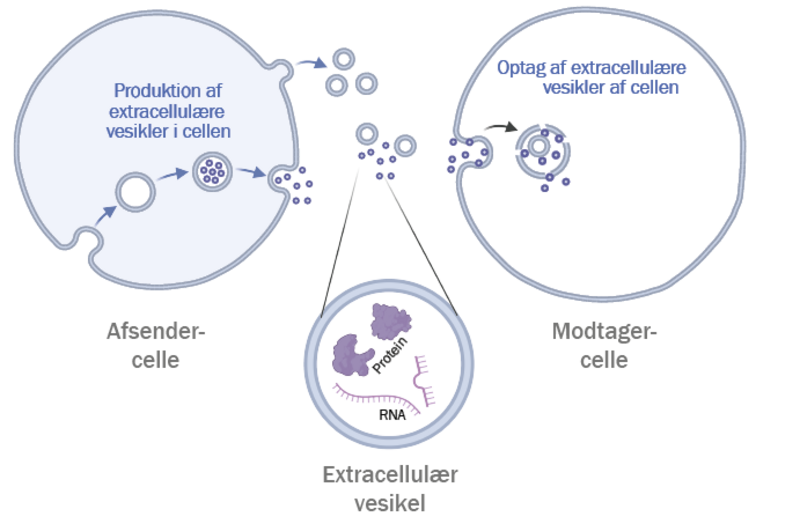 Celler kan sende signaler til hinanden ved hjælp af ekstracellulære vesikler, små naturlige blærer, der indeholder biologiske signalmolekyler som RNA og proteiner. Figuren viser, hvordan en afsendercelle danner og udskiller vesikler, som derefter optages af en modtagercelle. Overordnet er der to måder, cellen producerer ekstracellulære vesikler (som kaldes henholdsvis mikrovesikler og exosomer). I laboratoriet kan vi som udgangspunkt ikke skelne mellem dem, men vi ved, at de dannes på to forskellige måder. Normalt er exosomerne dog mindre end mikrovesiklerne.