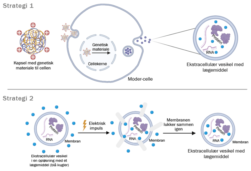 Figuren viser to overordnede strategier til at pakke lægemidler ind i ekstracellulære vesikler: Øverst: genetisk materiale overføres til en moder-celle. Cellen modtager et signal om at producere ekstracellulære vesikler med indhold af det ønskede lægemiddel.