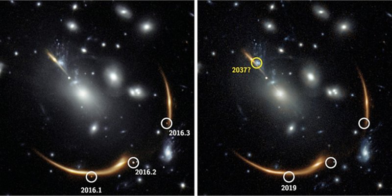 Fordi lyset i disse tre billeder er ankommet med et par måneders forskydelse, giver de os tre forskellige syn på udviklingen af eksplosionen. I det sidste billede er supernovaen endnu ikke eksploderet. Men ved at undersøge, hvordan galakserne ligger fordelt i galaksehoben, og hvordan billederne er forvrænget af det krumme rum, er det faktisk muligt at beregne, hvor langt “bagud i tid” dette billede er.