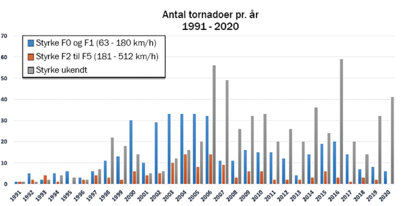 Vi kender specielt tornadoer fra den midtvestlige del af USA i et område der betegnes som Tornado-Alley. Men de optræder også i Europa, hvilket tjekkerne oplevede et dramatisk eksempel på i juni måned her i 2021. Også her i Danmark kan tornadoer opstå, om end det er en meget sjælden begivenhed. Men vi har antageligt haft flere episoder med danske tornadoer i de senere år, og i år var ingen undtagelse. Dette giver en god anledning til at se nærmere på dette fascinerende naturfænomen.