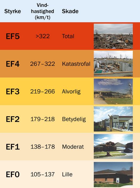 I USA bruger man den såkaldte EF-skala, som går fra 0-5, til at klassificere tornadoers styrke, hvor 5 er kraftigst. En EF-5 tornado vurderes til at have vinde på over 322 km/timen (89 m/s). Der er ingen, der har målt direkte på vinden i en tornado, men den 3. maj 1999 blev en tornados vindstyrke estimeret ud fra radardata til at have en vindstyrke på op til 512 km/t (142 m/s). Det er mere end 4 gange orkanstyrke. Til sammenligning er det kraftigste vindstød målt i Danmark på 53,5 m/s i forbindelse med orkanen Allan den 28. oktober 2013.