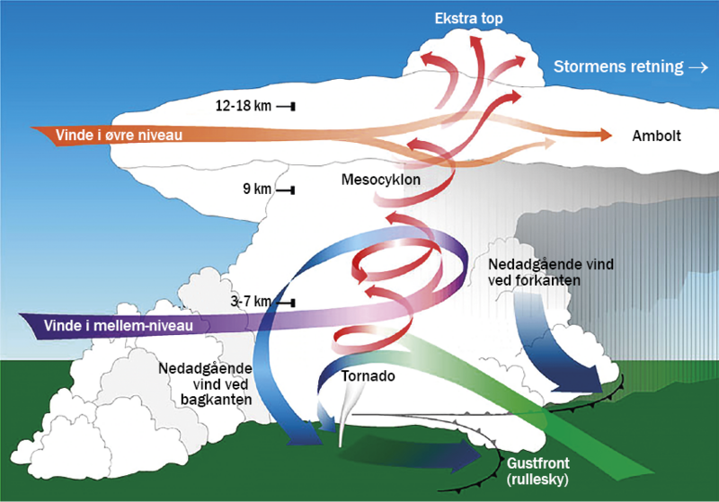 Illustration af en klassisk supercelle (der findes nemlig forskellige typer). I midten ses mesocyklonen, der er den roterende delmængde af den forvoksede superbyge. I denne figur er supercellen ledsaget af en tornado, som kommer under mesocyklonen. Til forskel fra en typisk dansk skypumpe, der gerne kommer i ydersiden af en bygesky, udspringer tornadoen fra bygens/supercellens “hjerte”.