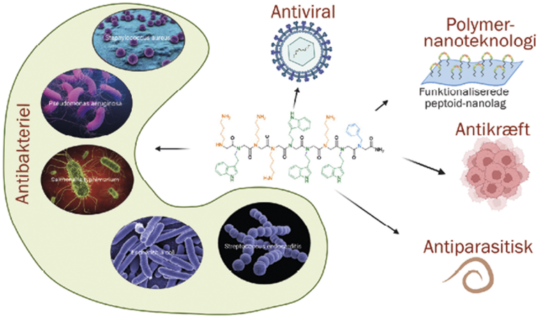 Peptider kan have mange forskellige funktioner i organismen, og dem, der er specifikt antimikrobielle, spænder fra 6 op til 40 aminosyrer i længden. Imidlertid er peptider tilbøjelige til at blive nedbrudt af enzymer, og det er en begrænsning for, hvor tilgængelige de kan være i kroppen. For at udnytte de gavnlige antimikrobielle egenskaber ved peptider og samtidig imødegå de strukturelle udfordringer, der gør dem let nedbrydelige, har forskere i det internationale forskningsnetværk Chiron Corporation Team udviklet en ny klasse af peptid-efterligninger kaldte peptoider. De seneste 10 år har der i forskerkredse været en kraftigt stigende interesse for at studere peptoider, og en stor del af disse studier handler om at udnytte deres antimikrobielle egenskaber. Mange forskere ser altså peptoider som en mulig ny klasse af antibiotika.