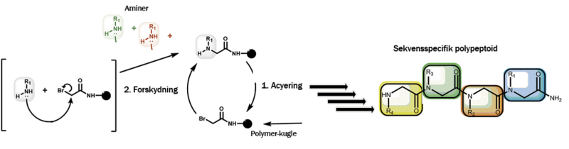 I det første trin (ikke vist) fjernes en kemisk gruppe, der beskytter en amingruppe koblet til polymerkuglen, og derefter gentages de to næste trin - henholdsvis acylering (1.) og forskydning (2.) – indtil den ønskede sekvens af aminer er opnået.