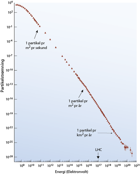 Vi har fået et par henvendelser om artiklen, hvor folk er forvirrede over positionen af pilen i figuren nederst til højre på side 11: "Der står 1017 eV men LHC er da kun 7 TeV (7x1012 eV, endnu ikke opnået faktisk)?"