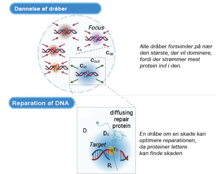 I de seneste år har man kunnet påvise, at der omkring det skadede DNA-område dannes en mikro-struktur med radius på cirka 100 nm, kaldet et fokus. Dette fokus har vist sig at være en egentlig dråbe, og den opstår på samme måde, som hvis man tilfører en smule olie til et glas med vand, hvor olie-molekylerne vil mindske deres frie energi ved at samles i en dråbe. Indenfor fysikken siger vi, at der er sket en faseovergang. Det har vist sig, at et sådant lokalt miljø omkring det skadede DNA giver cellen mulighed for at opregulere de proteiner, der er nødvendige for reparationsprocessen og dermed øge effektiviteten og kvaliteten. Det er en ekstremt effektiv måde at optimere reparationen af DNA, idet de nødvendige reparationsproteiner på den måde bliver samlet på rette tid og sted i cellen.