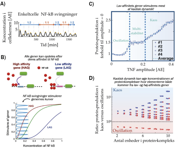 Først og fremmest er det nærliggende at overveje, hvorledes oscillationer kan regulere specifikke gener. Vi har i vores forskning studeret dynamikken af koncentrationen af NF-kB, der som tidligere nævnt kan sættes i svingninger og endda svinge med to forskellige periodelængder, hvis det stimuleres udefra. Som en grundlæggende model, har vi opdelt alle gener, der stimuleres af NF-kB-proteinet efter deres affinitet, det vil sige hvor let de kan stimuleres af NF-kB. Her har vi kunnet vise, at vi kan stimulere henholdsvis lav- og højaffinitets-gener ved at ændre på, hvordan koncentrationen af NF-kB svinger. Således kan man med store amplituder stimulere gener med lav affinitet, mens man med en mere konstant gennemsnitsværdi (og dermed mindre svingninger) kan stimulere gener med høj affinitet. Det åbner for en helt ny måde at betragte gen-regulering, idet man med oscillerende dynamik kan op- og nedregulere hele familier af gener med den samme transkriptionsfaktor, der udelukkende virker stimulerende på de forskellige gener.