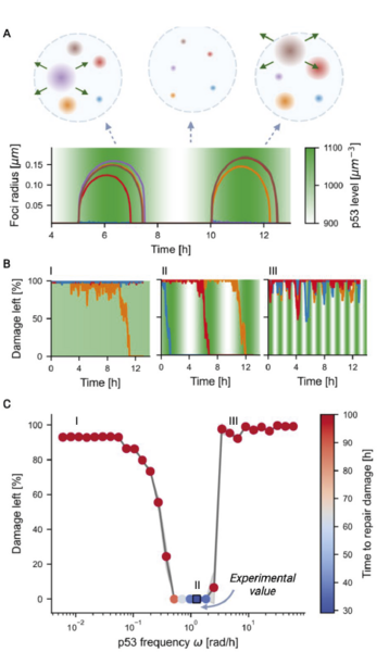Man ved, at transkriptionsfaktoren p53 stimulerer syntesen af adskillige proteiner, der er relateret til DNA-reparation, men det har tidligere været uvist, om oscillationer i koncentrationen af p53 faktisk kan øge reparationen af DNA. Her er det interessant, som vi nævnte i indledningen, at koncentrationen af p53 kun begynder at svinge, når der er mange skader på DNA’et (cirka 10 brud på DNA’s dobbeltstreng). Her kan man forestille sig, at cellen ikke har ressourcer til at lave dråber omkring alle steder med brud, men må koncentrere ressourcerne om enkelte steder. På den måde kan en oscillerende koncentration af proteiner give en afgørende tidsskala for, hvornår dråberne opløses og nye skabes gennem tidsrum, der svarer til præcis den tid, det typisk tager at reparere et DNA-brud.