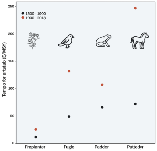 Tal for hvirveldyr og planter peger på, at arter typisk uddøde i et 100-200 gange højere tempo i 1900-tallet i forhold til baggrunden under rolige perioder i fortiden.