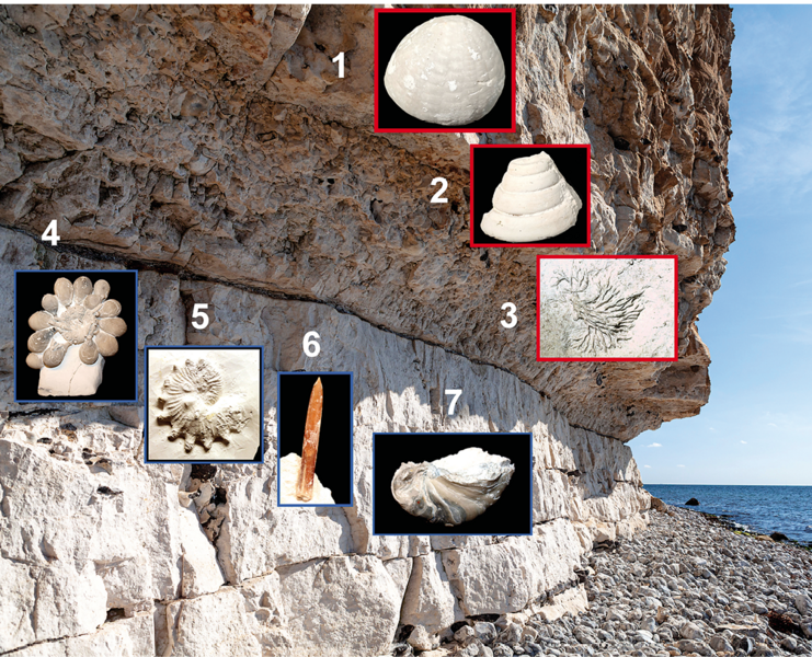De viste fossiler fra Palæogen er: 1. Echinocorys (søpindsvin), 2. Leptomaria (snegl), 3. Cyclostomata (mosdyr), mens de ældre fossiler fra Kridttiden er: 4. Tylocidaris (søpindsvin), 5. Ammonit, 6. Belemnit, 7. Pycnodonte (musling).
