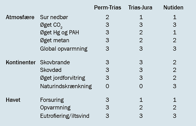 Udviklingen i atmosfæren, på kontinenterne og i havet er angivet i tabellen for en række forhold. Påvirkningerne er graduerede på en subjektiv skala fra 3: Meget stærk; 2: En del; 1: Lille; 0: Ingen. Hg er kviksølv, og PAH angiver polycykliske aromatiske kulbrinter, der dannes ved skovbrande, ufuldstændig forbrænding m.m. Efter især Fox (2022), Van de Schotbrugge, Wu et al. (2015) og Müller et al. (2023).