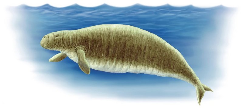 Tegning af Stellers søko, der tidligere levede langs kysterne i det nordlige Stillehav. Hovedet var lille, kroppen op til 9 meter og vægten voldsomme 8-10 tons. Da den blev opdaget i 1741, fandtes den kun ved Kommandør-øerne i Beringshavet. Bestanden var i aftagen, formodentlig fordi den havde hård konkurrence fra søpindsvin, der spiste samme føde som søkøerne (fastsiddende rød- og brunalger). Søpindsvinenes antal kontrolleres af havoddere, som blev nedlagt i stort antal på grund af deres værdifulde pels. Stellers søko var et nemt bytte for fangere og blev udryddet på bare 27 år.