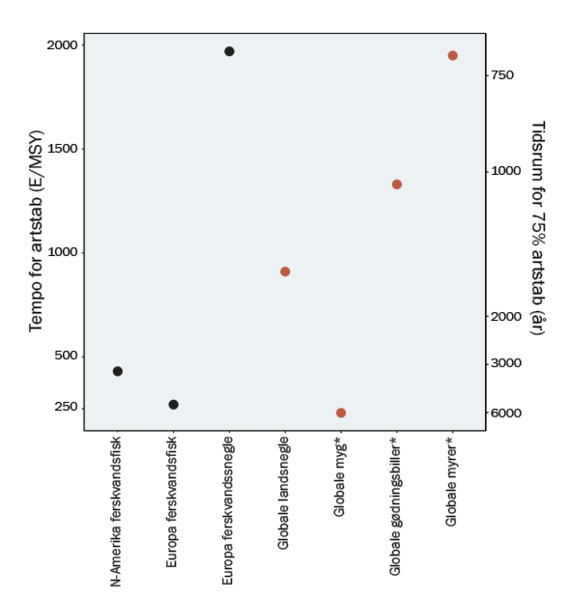 Tempo for uddøen af arter i de seneste 100 år (venstre y-akse) og tidsrum for uddøen af 75 % af arterne i fremtiden med uændret tempo (højre y-akse). Værdier for nordamerikanske og europæiske ferskvandsfisk, europæiske ferskvandssnegle og gennemsnit for alverdens landsnegle. *Den globale uddøen for myg, gødningsbiller og myrer er beregnet under den forudsætning, at primær tropisk skov forsvinder med uændret tempo og er væk om 225 år og omdannet til sekundær opvækst og spredte skovrester.