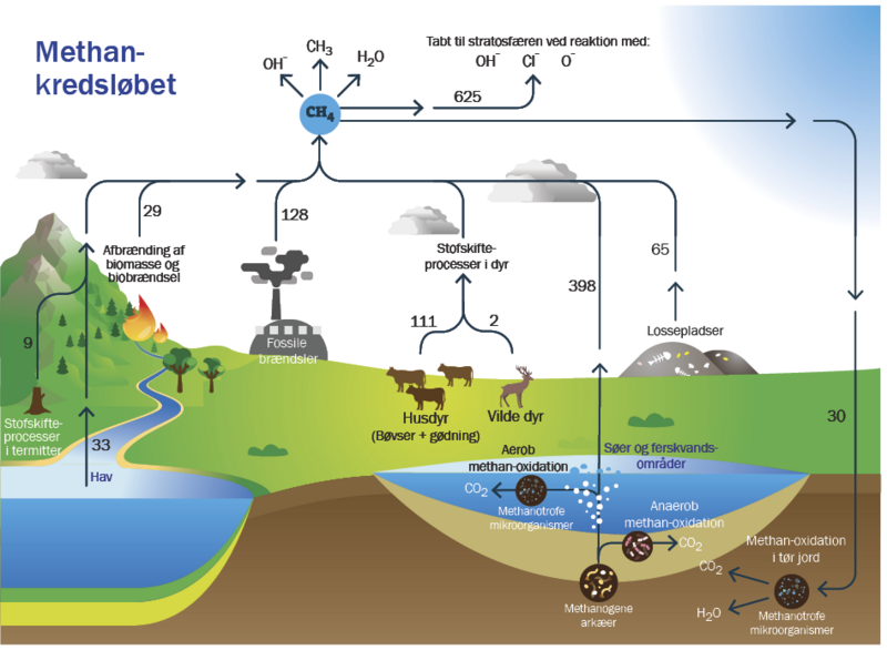 Figuren viser de væsentligste kendte kilder til udledning af methan til atmosfæren. Tallene angiver den omtrentlige årlige udledning i millioner tons (bemærk, at der er store usikkerheder på disse tal).
