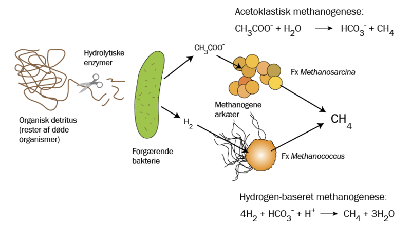 Methanogenesen kan også involvere omdannelsen af acetat (CH3COO-) til methan og CO2. Også denne såkaldt “acetoklastiske methanogenese” udføres af methanproducerende arkæer og involverer flere enzymer og komplekse biokemiske processer.