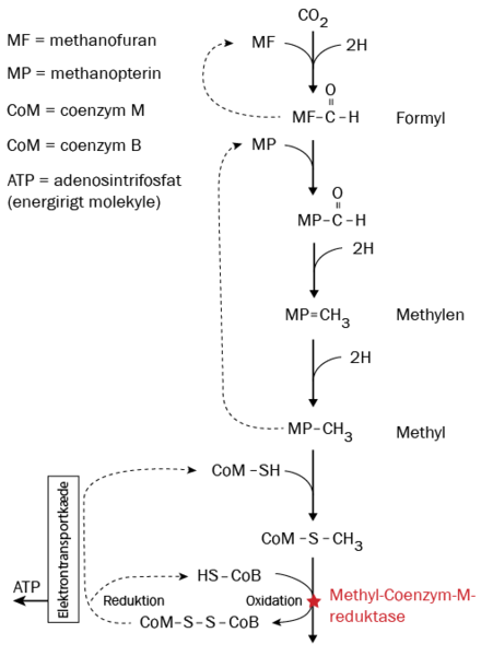 Det sidste trin i reaktionen (markeret med en rød stjerne) er katalyseret af et enzym kaldet methyl-CoM-reduktase, der er et nøgleenzym i methanproducerende arkæer.
