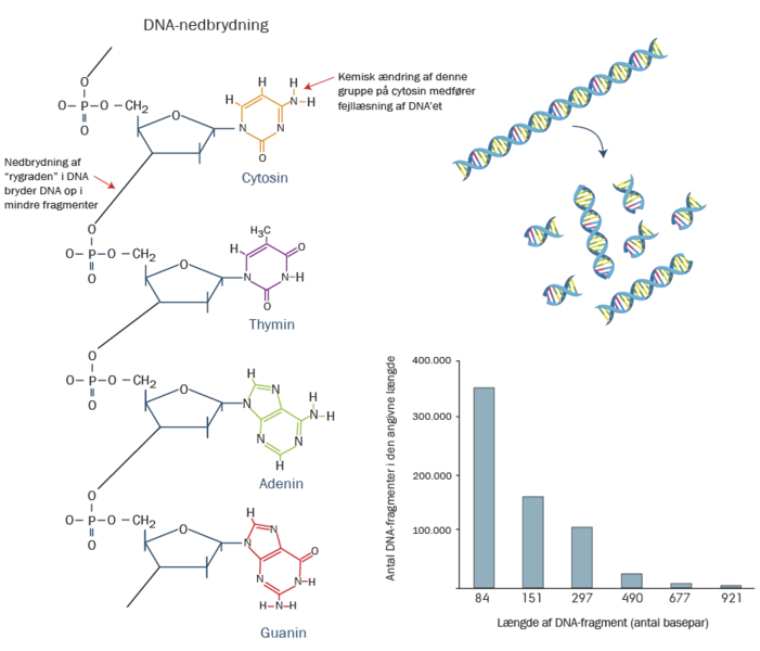 Figuren viser til venstre den kemiske struktur af en DNA-streng med de fire DNA-baser markeret med forskellige farver. Der er angivet de to vigtigste nedbrydnings-mekanismer. Udfordringen for forskerne i miljø-DNA har længe været, at metoder, der skulle aflæse sekvensen (altså baserækkefølgen) på DNA-fragmenter krævede, at disse var mindst 100 baser lange. Og som det fremgår af diagrammet, findes der langt flere fragmenter under denne målegrænse i miljøet. De nyeste sekventerings-teknikker er dog mere fintfølende, og derfor rykker grænserne for, hvor små stykker DNA-forskerne kan bestemme, sig hele tiden.
