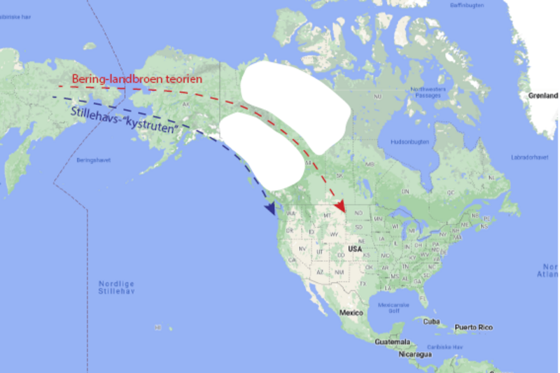 Kortet illustrerer to teorier om, hvordan de første mennesker indvandrede til det nordamerikanske kontinent fra Sibirien over det tilfrosne Beringstræde for et sted mellem 23.000 og 14.000 år siden, hvor store dele af Nordamerika stadig var dækket af is. Ifølge den mest udbredte teori er dette foregået gennem en isfri korridor over land, men Eske Willerslevs forskning har vist, at det er mere sandsynligt, at de er sejlet langs Stillehavskysten.
