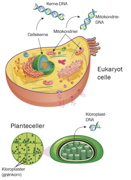 I den eukaryote celle findes DNA i cellekernen, men også i cellens energikraftværker, mitokondrierne, findes der DNA. Mens kerne-DNA nedarves ligeligt fra mor og far, nedarves mitokondrie-DNA kun fra moren.
