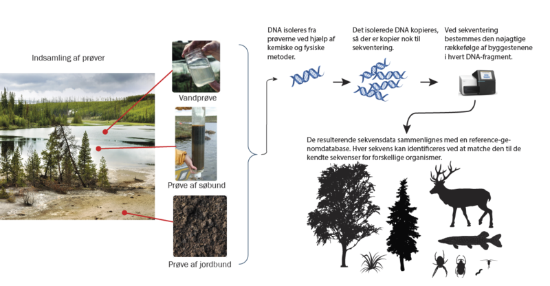 Undersøgelser af miljø-DNA (eDNA) har åbnet en fascinerende dør til fortidens økosystemer. Figuren viser den principielle arbejdsgang i arbejdet med miljø-DNA. En af de nyeste teknikker, der anvendes i disse studier, kaldes “shotgun sekventering”. Der er i lighed med metabarcoding en molekylærbiologisk metode, der bruges til at bestemme, hvilke organismer der er til stede i en given miljøprøve uden forudgående kendskab til, hvilke organismers DNA, der er til stede i prøven. Men hvor metabarcoding udelukkende bruger mitokondrie-DNA og kloroplast-DNA, fanger shotgun sekventering alle slags DNA i en prøve – også DNA fra cellekernen – og metoden kan derfor give meget mere genetisk information. Grafikker brugt i illustrationen: Colourbox.