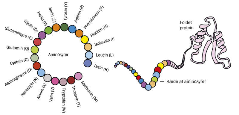 Ligesom DNA er opbygget af en kæde af sammenbundne molekyler kaldet nukleotider, så er proteiner sammensat af en kæde af aminosyrer. Vi mennesker har 20 forskellige aminosyrer i vores repertoire, og med forskellige sammensætninger af disse i lange kæder dannes alt fra enzymer til antistoffer. Aminosyrer har forskellige egenskaber: Nogle har en elektrisk ladning, nogle er klistrede, nogle vil gerne interagere med vand, andre vil ikke.