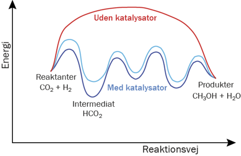 Et katalytisk materiale er et materiale, der kan øge hastigheden i en kemisk reaktion, uden selv at blive opbrugt eller omdannet i processen. Et godt eksempel er kobber, som kan bruges til at få carbondioxid, CO2, til at reagere med hydrogen, H2, og danne ønskede produkter, for eksempel metanol, CH3OH. Kobber kan altså hjælpe os med at reducere mængden af CO2 i atmosfæren og opnå et carbonkredsløb uden fossile brændstoffer ved at omdanne CO2 til et andet molekyle – metanol – som der er stor efterspørgsel på i den kemiske industri, og som også kan bruges som et syntetisk brændstof.
