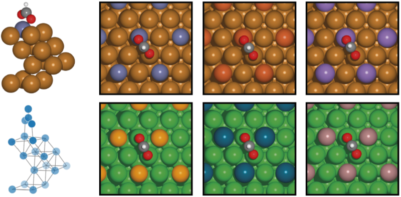 Venstre: Den geometriske struktur (øverst) og strukturen repræsenteret som en matematisk graf (nederst) for molekylet format (HCO2) på en kobber-overflade iblandet zink.