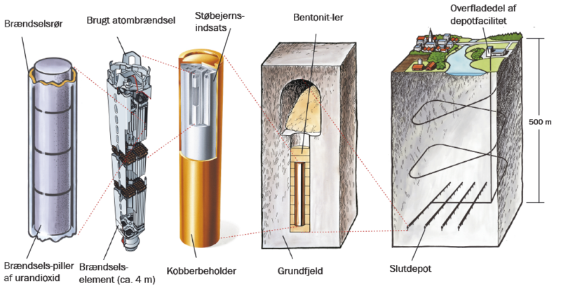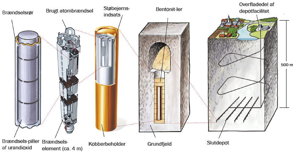 Gennem brændselsprocessen omdannes uran via fission til lettere grundstoffer, for eksempel radioaktive isotoper af iod, strontium og cæsium. Efter brændselsprocessen er det brugte atombrændsel varmt – både hvad angår radioaktivitet og temperatur. For at håndtere temperaturen sænkes det brugte atombrændsel ned i et midlertidigt opbevaringsbassin. Efter at have opholdt sig der i typisk 1-3 år, er de mest intense, kortlivede isotoper henfaldet, og varmeafgivelsen fra brændslet er reduceret nok til, at brændslet kan overføres til store, solide beholdere med flere beskyttelseslag. Disse beholdere sendes derefter til langsigtet opbevaring i geologiske depotfaciliteter.