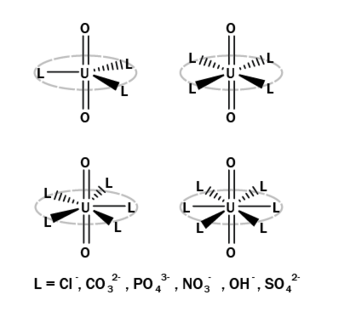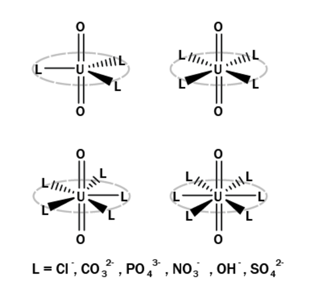 I vandig opløsning findes uran næsten udelukkende som ionen uranyl. Uranyl dannes ved, at et uran-atom afgiver 6 elektroner fra sin metalliske tilstand og bindes stærkt til to oxygenatomer, så det danner et lineært molekyle med den kemiske formel UO22+. Molekylets lineære form frigør et “bælte”, hvor negativt eller delvist negativt ladede ioner eller ligander kan binde elektrostatisk til uranyl-ionen. Alt efter bindingsstyrken og størrelsen af ionen kan uranyl have 3-6 ioner bundet.