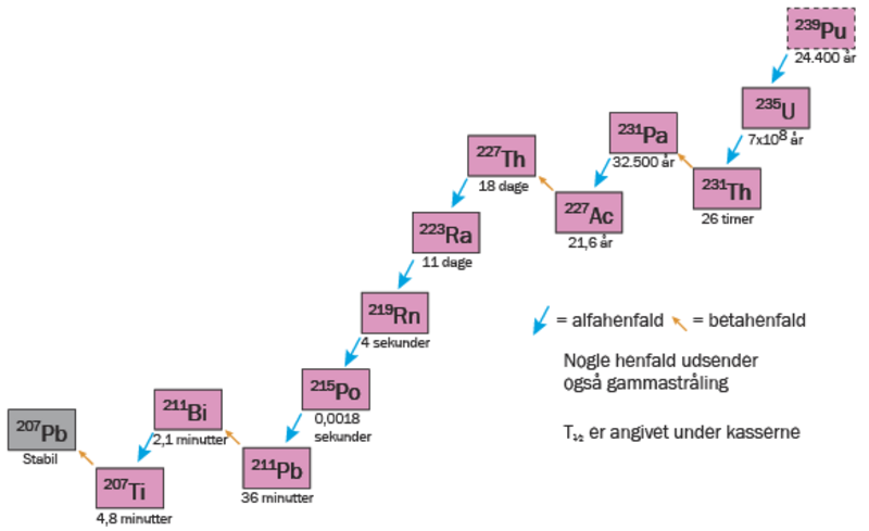 De fleste radioaktive isotoper henfalder ikke direkte til et stabilt stof, men gennemløber en serie af henfald til den stabile isotop. På figuren ses en sådan henfaldsserie (også kaldet henfaldskæde, i dette tilfælde actinium-kæden) for isotopen plutonium-239, der ultimativt henfalder til den stabile isotop bly-207.
