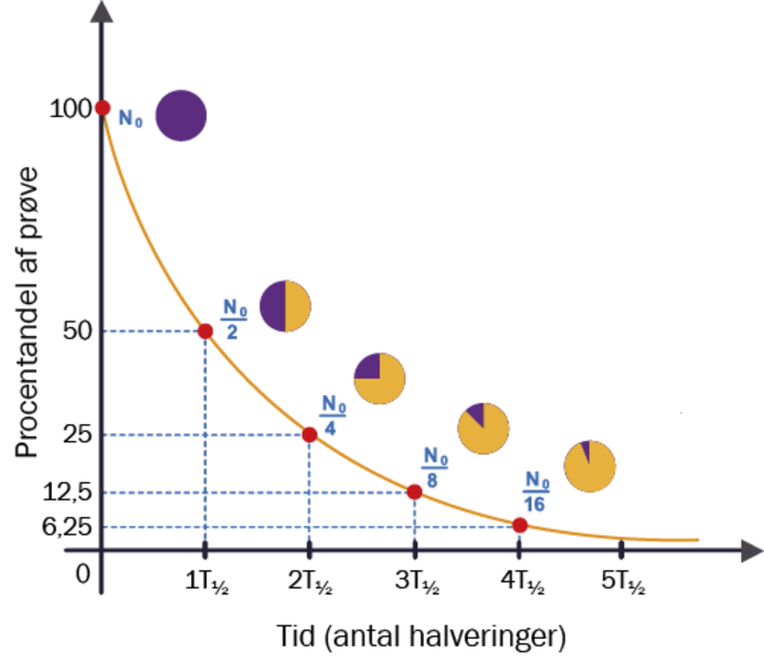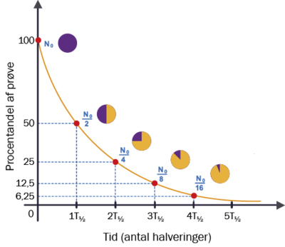Halveringstiden er den tid, det tager, for halvdelen af atomkernerne i et materiale at henfalde. Grafen på den øverste figur viser, hvordan henfaldet af et hvilket som helst radioaktivt stof beskriver en eksponentiel kurve.